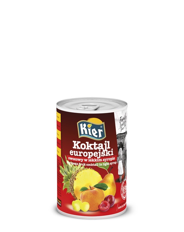 Bestandteile: Früchte (Pfirsiche, Birnen, Ananas, Trauben, gefärbte Kirschen (E-127), Easser, Zucker, Säureregulator Zitronensäure.