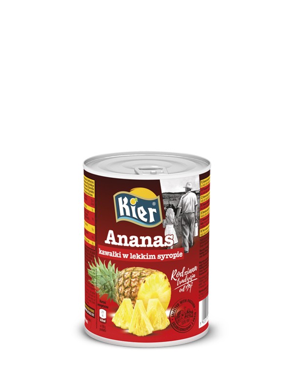 Masa netto: 565 gMasa po odcieku: 340 gSkładniki: Ananas, woda, cukier, regulator kwasowości - kwas cytrynowy.Ilość sztuk w kartonie: 24