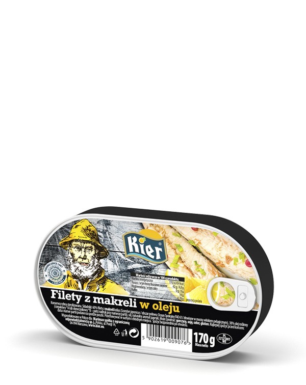 Masa netto: 170 gSkładniki: Filety z makreli (60 % przed sterylizacją, olej rzepakowy (40 % przed sterylizacją), sól. Może zawierać: gorczycę, gluten, mleko, seler, soję. Produkt sterylizowany.Ilość sztuk w kartonie: 24